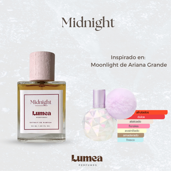 Midnight es una fragancia suave y encantadora que combina notas dulces y afrutadas con un fondo cálido y reconfortante. Inspirada en Moonlight de Ariana Grande, esta esencia captura un aura etérea y romántica, perfecta para acompañarte en momentos especiales o simplemente para envolver tu día con un toque de dulzura y serenidad. Ideal para quienes buscan una fragancia delicada pero con personalidad.